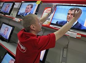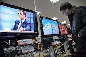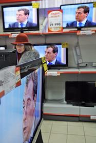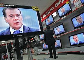 Президент России Дмитрий Медведев (на экранах телевизоров в магазине "М-Видео") во время интервью…
