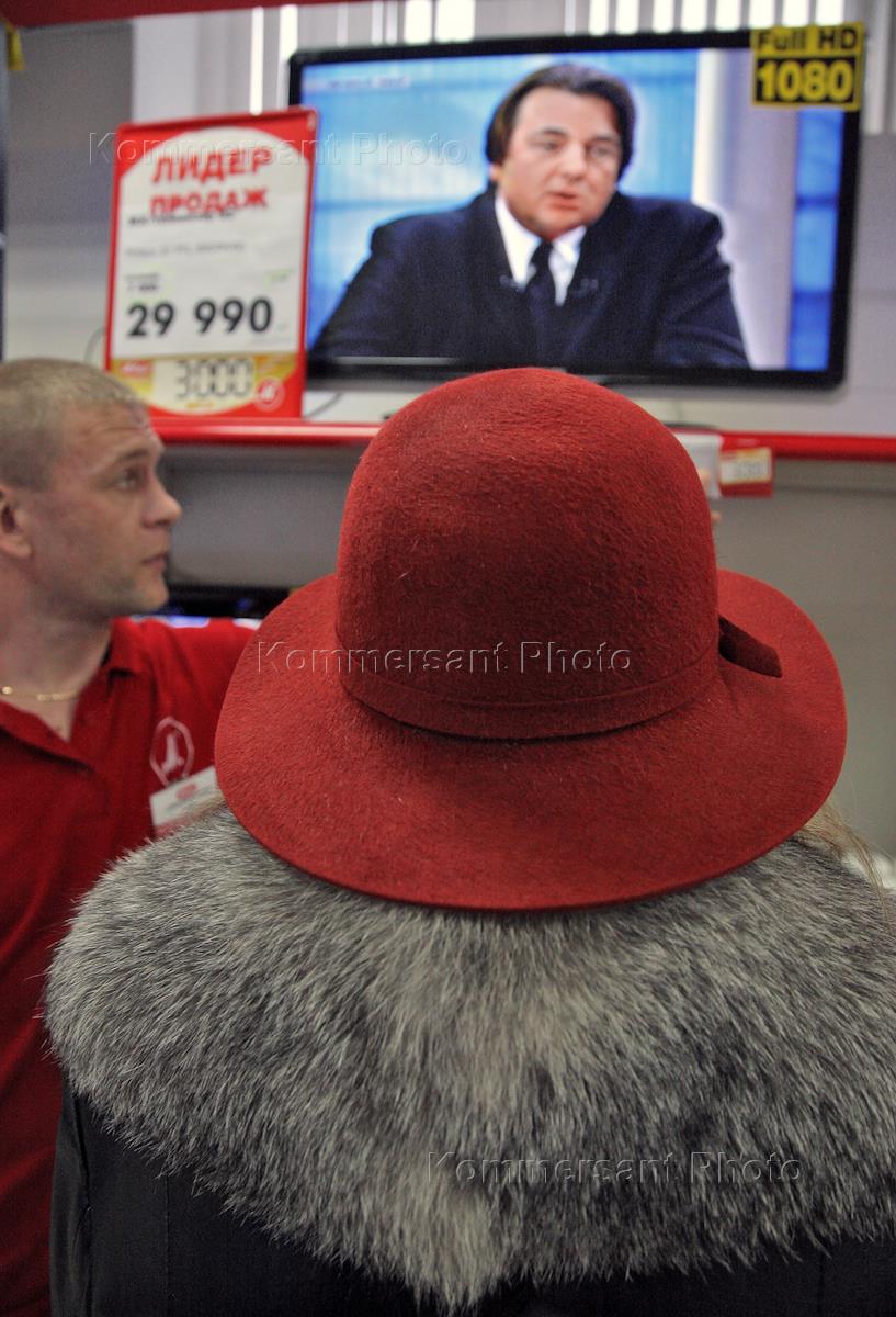 Генеральный директор телекомпании "Первый канал" Константин Эрнст на экране телевизора в магазине…
