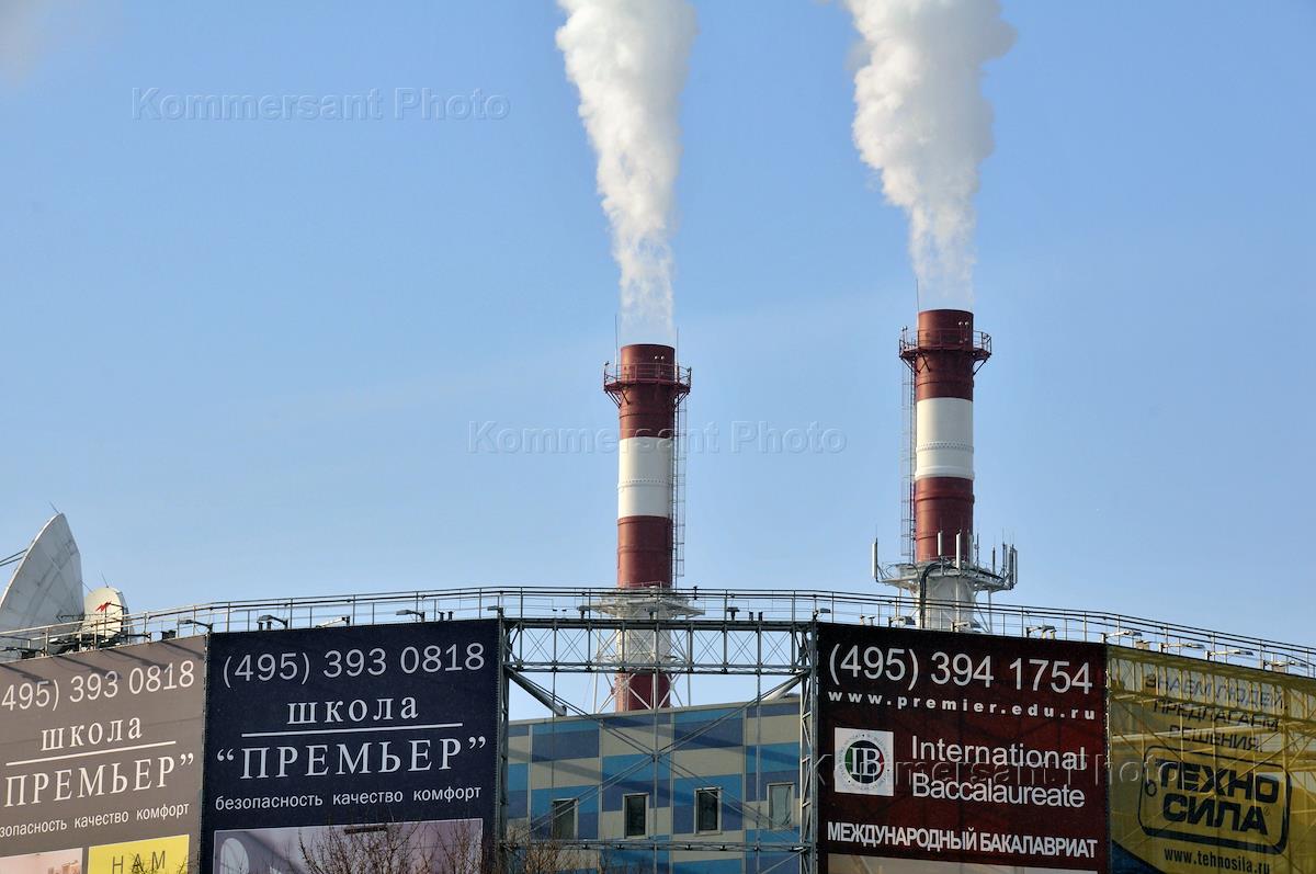 Промышленный пейзаж. Дым из труб городской теплоэлектроцентрали.