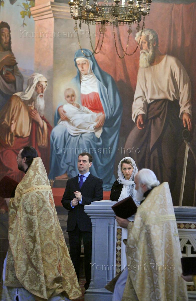 Президент России Дмитрий Медведев (второй слева) с супругой Светланой (вторая справа) на…