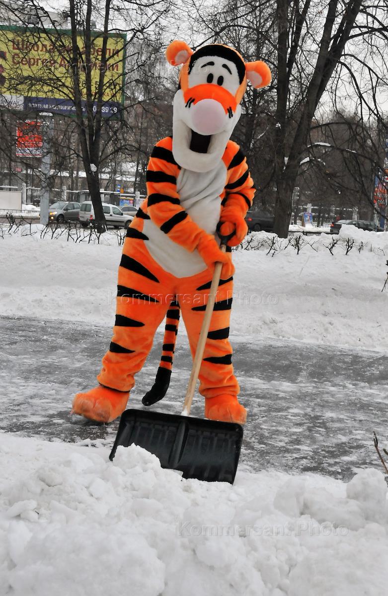 Подборка. Фото из личного архива. Молодой человек в костюме тигра убирает снег.