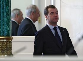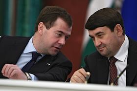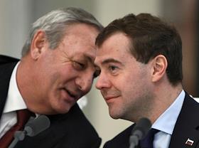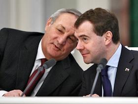 Президент России Дмитрий Медведев (слева) и министр транспорта России Игорь Левитин (справа) во…