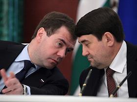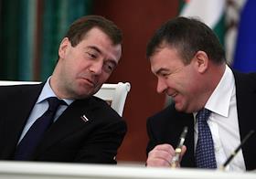 Президент России Дмитрий Медведев (слева) и министр обороны России Анатолий Сердюков (справа) во…