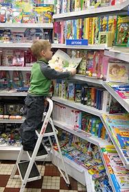 Ребенок с детским журналами у стеллажей в магазине периодической печати компании "Сейлс".