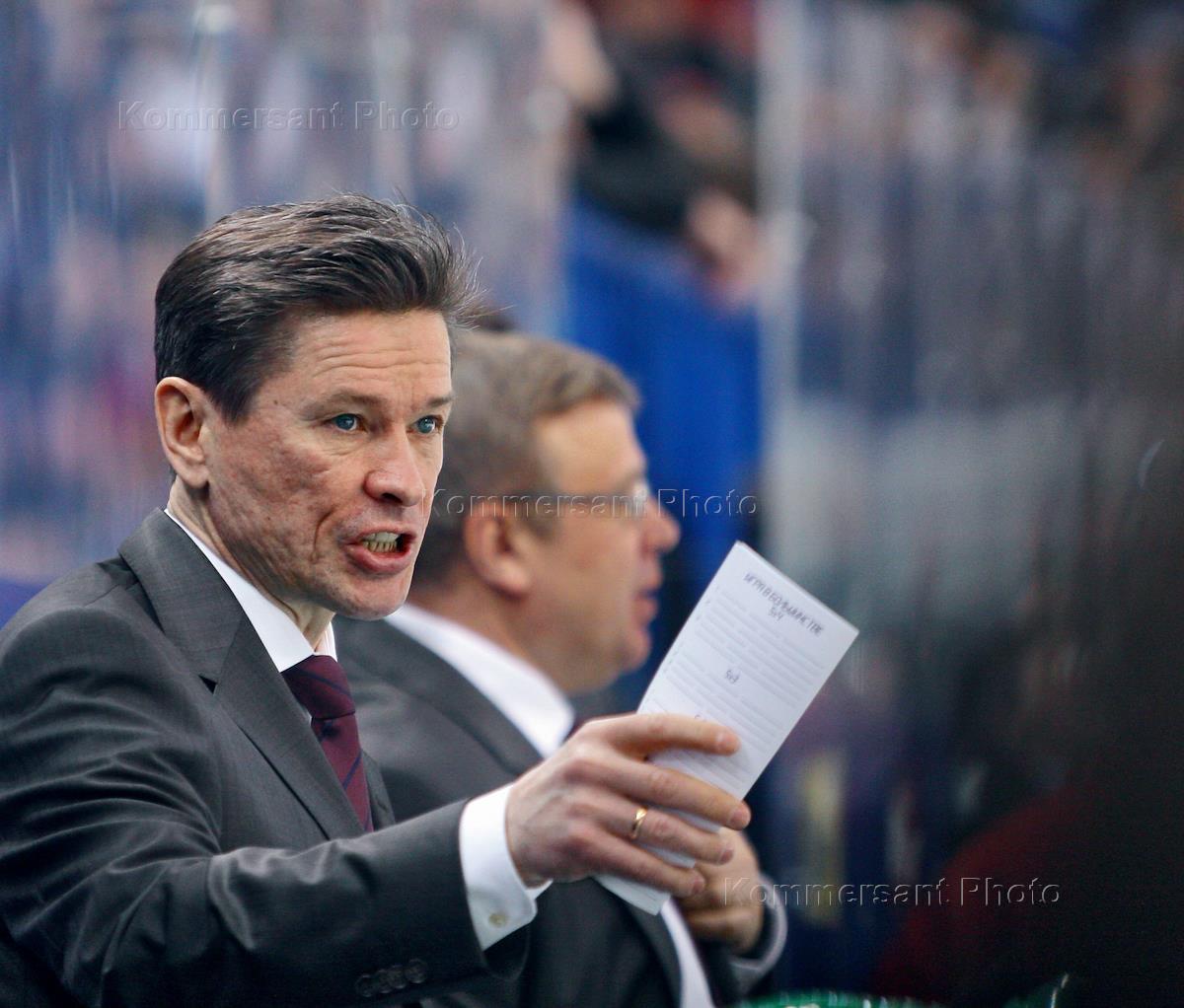 Матч Кубка Континента КХЛ. Главный тренер ХК "Салават Юлаев" Вячеслав Быков (слева) во время матча…