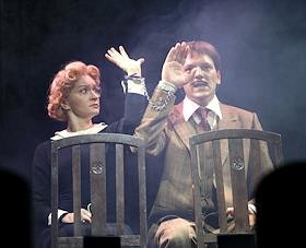 Актеры Анна Якунина (слева) и Дмитрий Щербина (справа) во время пресс-показа спектакля "39 ступеней"…
