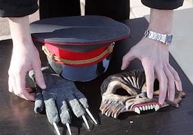 Жанровая фотография. Милицейская фуражка и маска вампира: перчатка с когтями и лицо с клыками.
