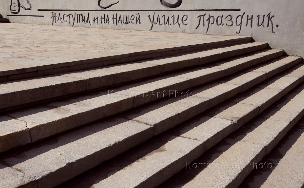 Мемориальный комплекс "Мамаев курган" в Волгограде. Надпись на подпорной стене у лестницы, ведущей…