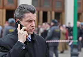 Последствия взрыва на станции метро "Парк культуры". Мэр Москвы Юрий Лужков (в центре) у штаба МЧС…
