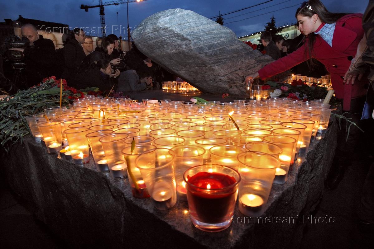 Гражданская акция памяти жертв терактов в московском метро "Без слов", в сквере у Соловецкого камня на Лубянской площади.