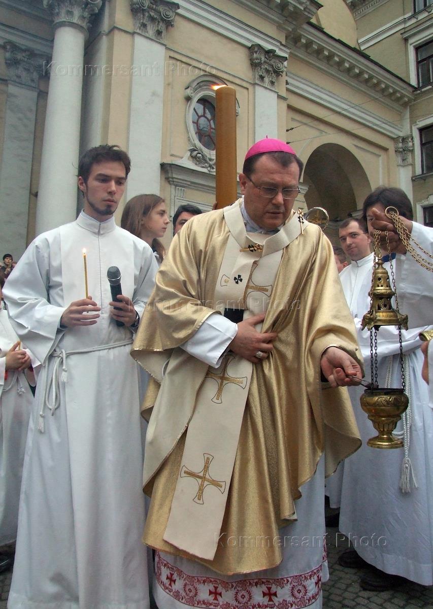Пасхальную службу в в храме св. Екатерины проводил архиепископ, глава католической архиепархии в Москве Паоло Пецци.