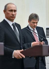 Пресс-секретарь правительства России Дмитрий Песков (справа) на совместной пресс-конференции…