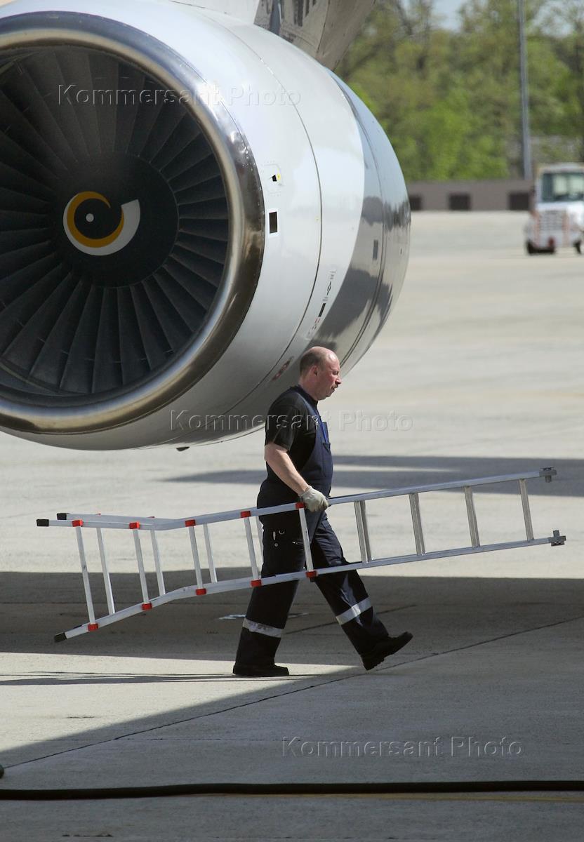 Жанровая фотография. Сотрудник аэропорта во время подготовку самолета к полету.