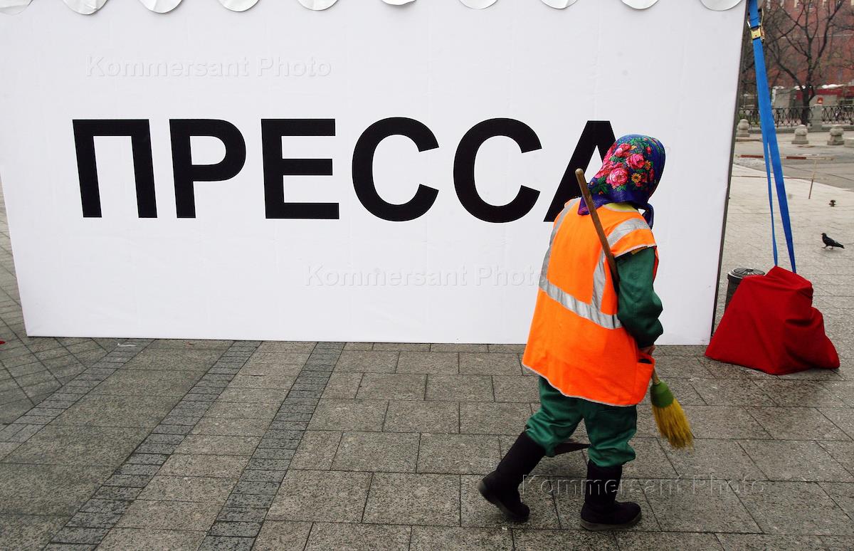 Жанровая фотография. Дворник на фоне стенда с надписью "пресса".