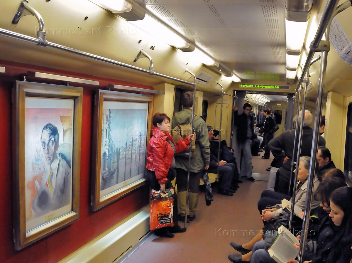 Пассажиры в поезде "Акварель", оформленном картинами Школы акварели художника Сергея Андрияки,…