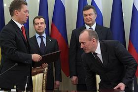 Президент России Дмитрий Медведев (за столом слева) и президент Украины Виктор Янукович (за столом…