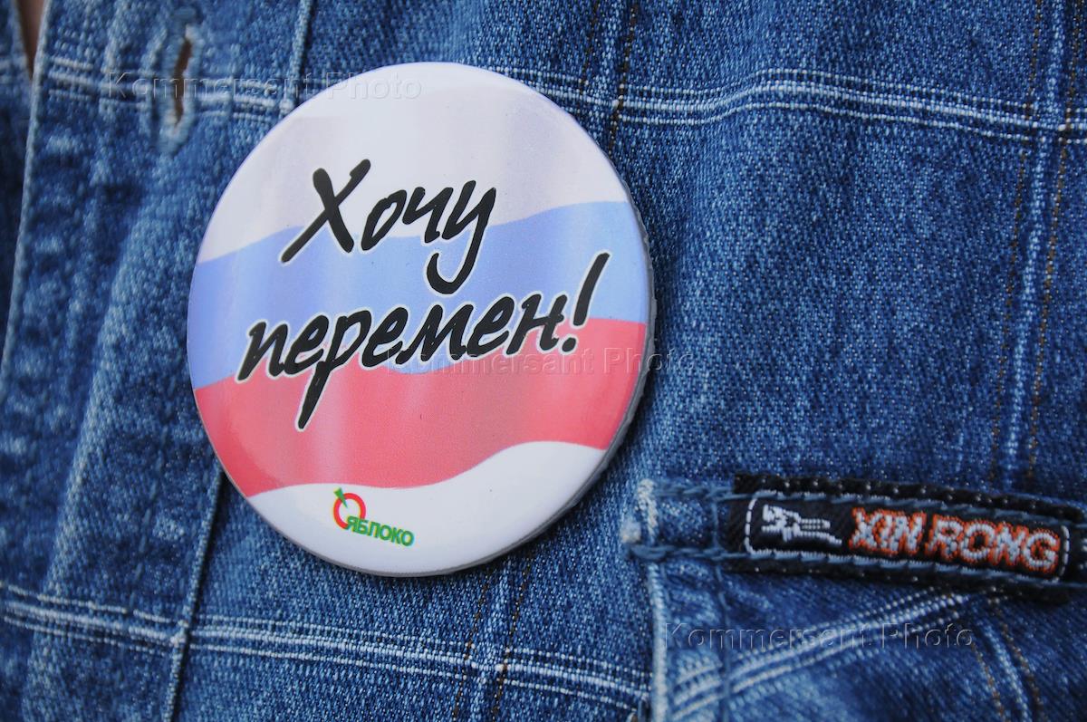 Акция протеста "День гнева". Значок "Хочу перемен!" у участника акции.