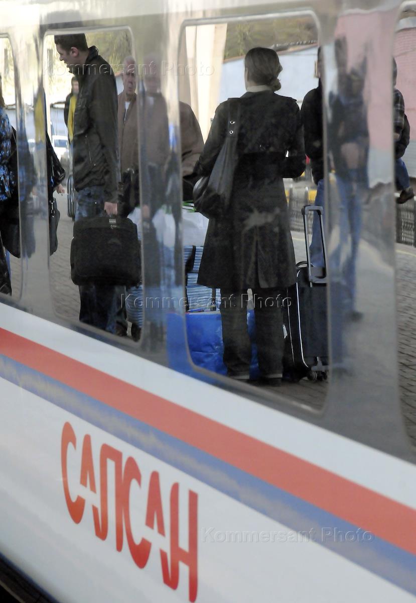 Скоростной поезд "Сапсан" у платформы Ленинградского вокзала.