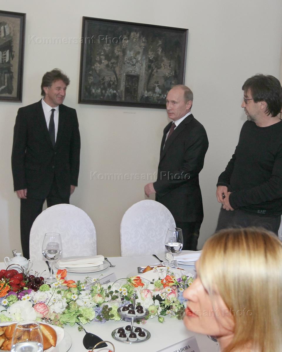 Слева направо: председатель правительства России Владимир Путин, актер Леонид Ярмольник и музыкант…