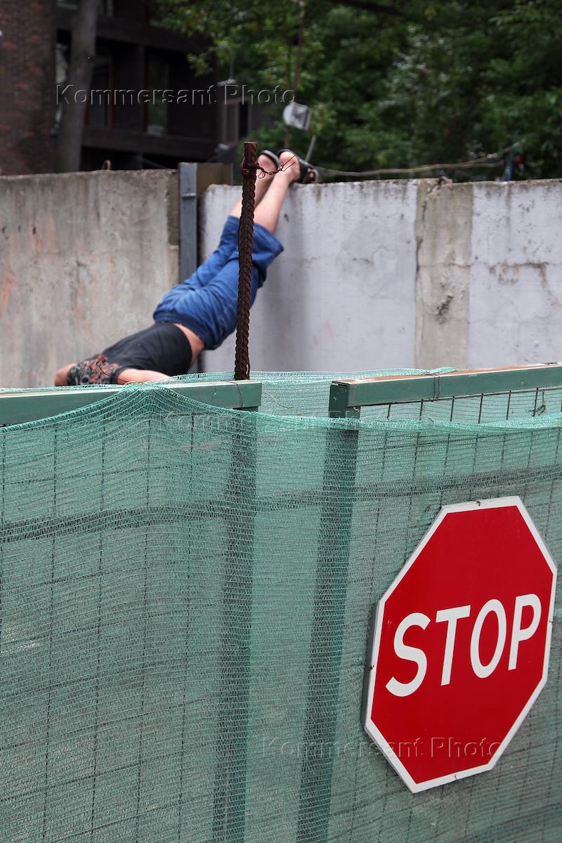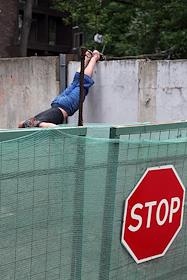 Жанровая фотография. Мужчина, перелезающий через забор.