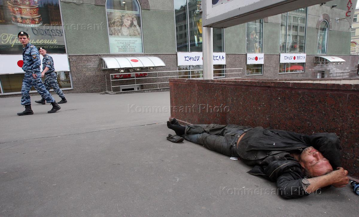 Жанровая фотография. Мужчина спит на улице около парапета подземного перехода.