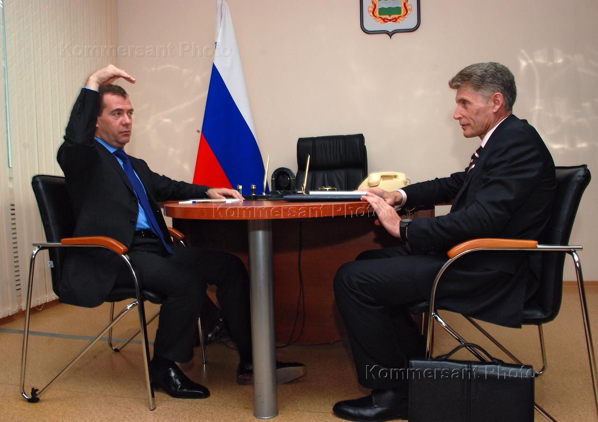 Президент России Дмитрий Медведев (слева) и губернатор Амурской области Олег Кожемяко (справа) во…