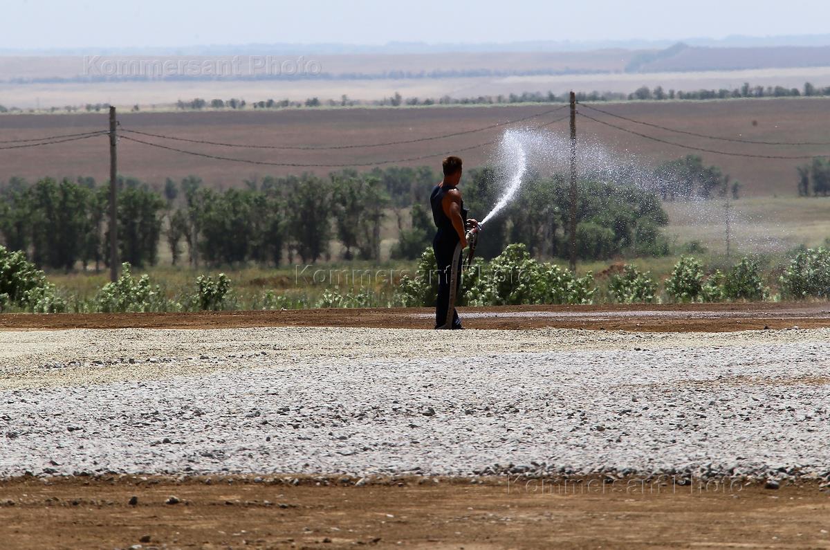 Жанровая фотография. Жара. Мужчина поливает из шланга землю.