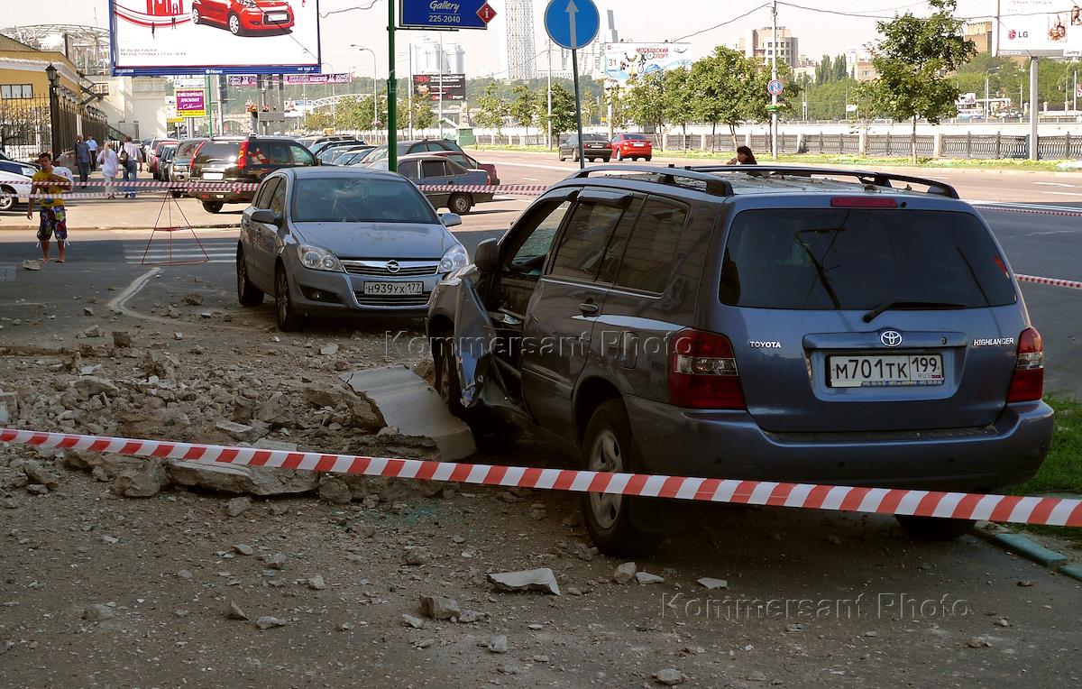 Жанровая фотография. Автомобили припаркованные за ограждение, там где идет ремонт фасада здания.…
