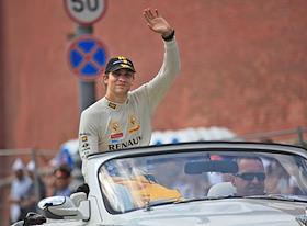 Российский пилот "Формулы-1" Виталий Петров во время парада участников автошоу Bavaria Moscow City…