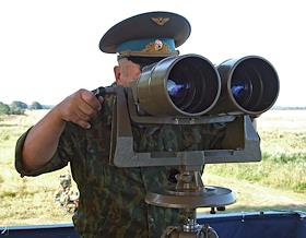 Жанровая фотография. Офицер наблюдает в полевой бинокль за проводами солдат 76-ой гвардейской…
