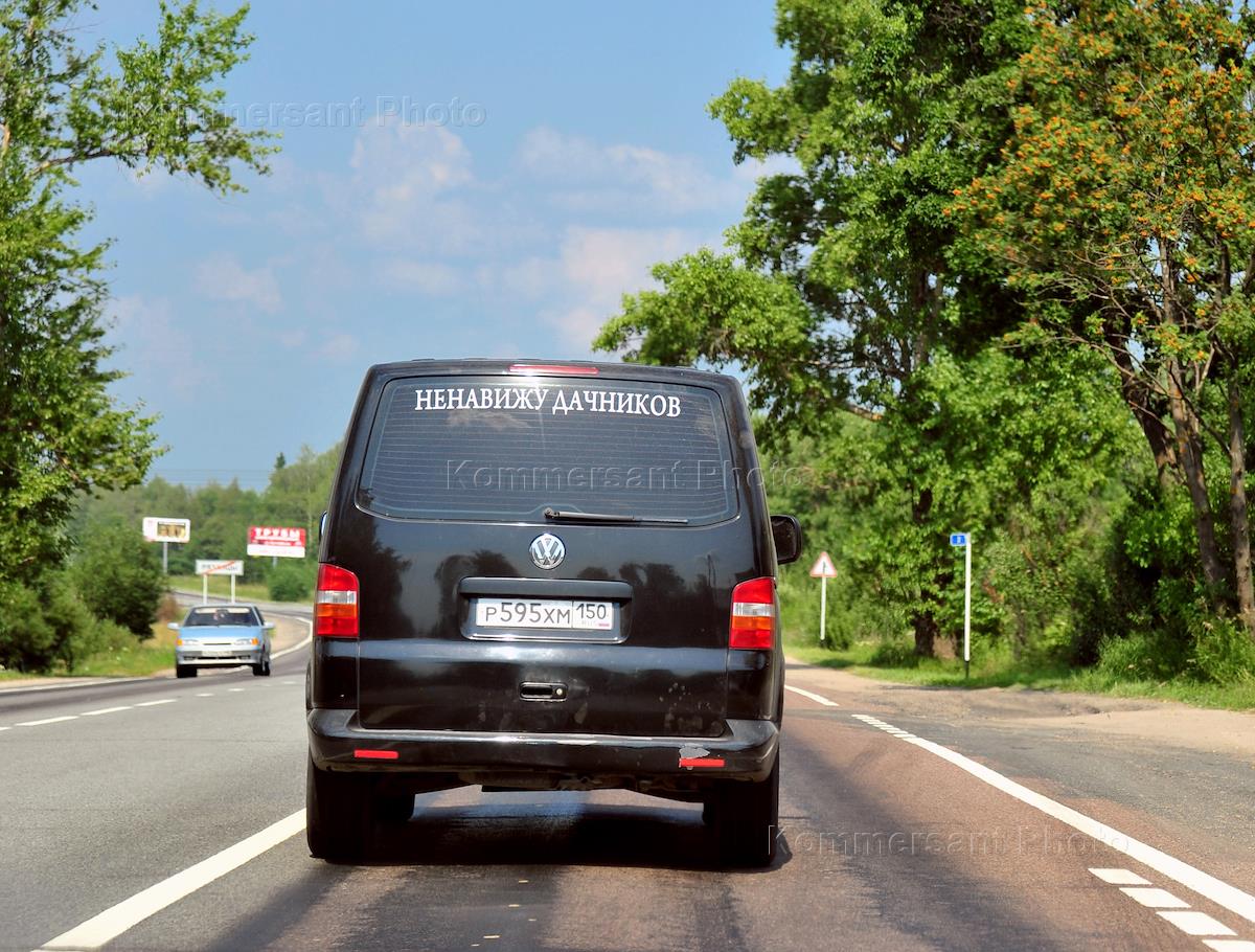 Жанровая фотография. Надпись на заднем стекле автомобиля Volkswagen "Ненавижу дачников".