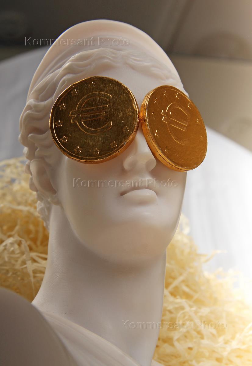 Жанровая фотография. Сувенирные "золотые" монеты евро на капители греческой колонны и бюст греческой…