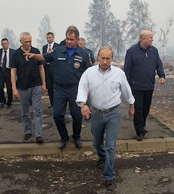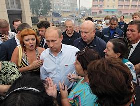 Председатель правительства России Владимир Путин (в центре) во время встречи с жителями сгоревшей…