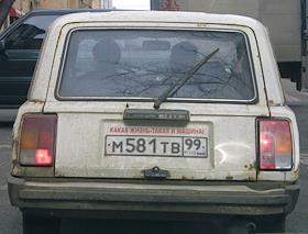 Автомобиль "Ваз - 2104" на улице города. Надпись на багажнике "Какая жизнь - такая и машина".