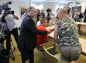 Председатель правителсьва России Владимир Путин (справа) во время встречи с жителями Луховицкого…