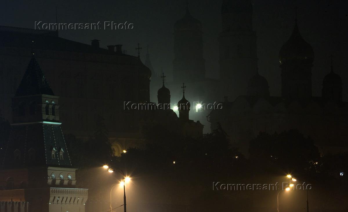 Жанровая фотография. Смог от лесных пожаров в Москве. Красная площадь ночью.
