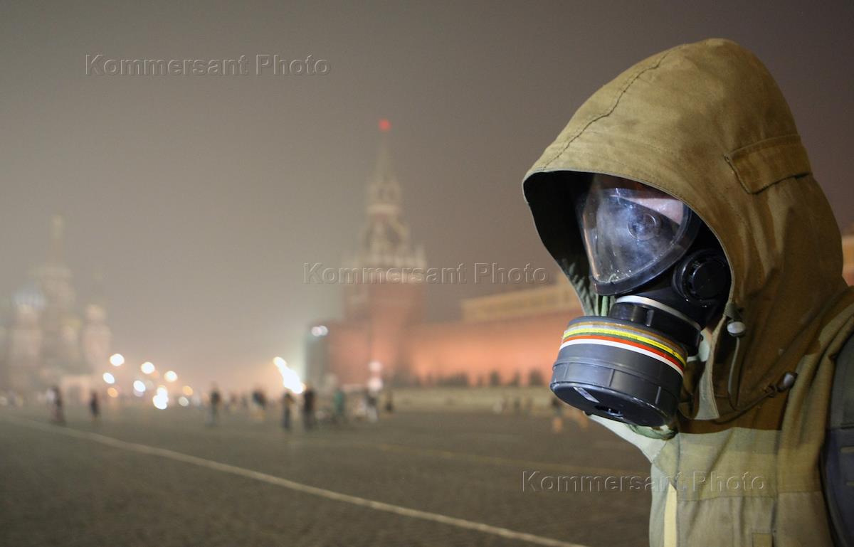 Жанровая фотография. Смог от лесных пожаров на Красной площади. Человек в противогазе слушает…