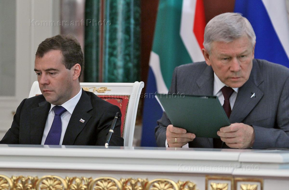 Справа налево: президент России Дмитрий Медведев, президент Южно-Африканской Республики Джейкоб…