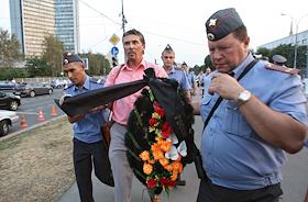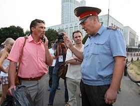Лидер федерации автовладельцев России (ФАР) Сергей Канаев (слева) после пикета за равенство прав…