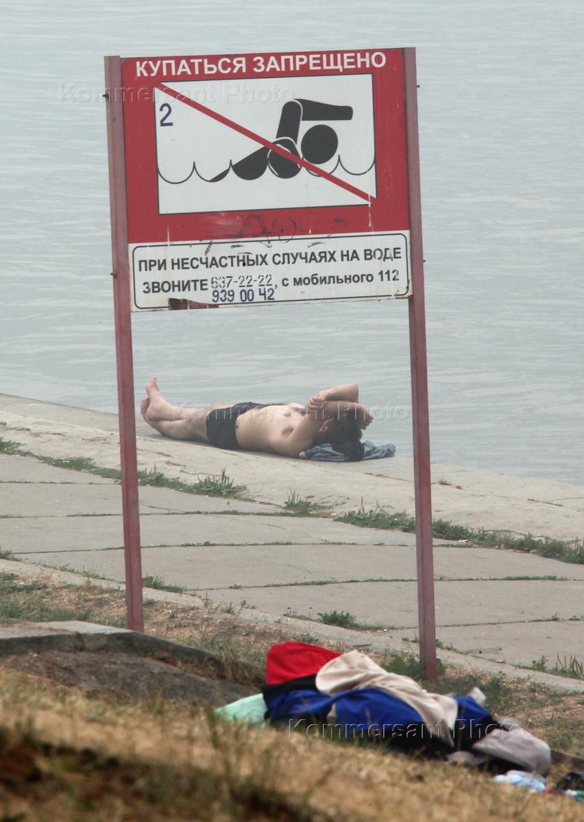 Жанровая фотография. Смог от торфяных и лесных пожаров в Москве. Мужчина загорает на берегу…
