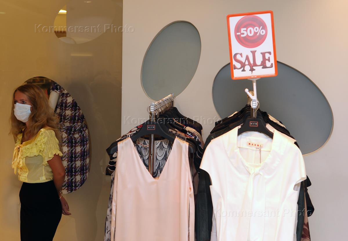 Жанровая фотография. Распрожажа в магазине одежды. Продавец в маске.