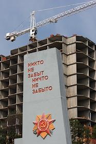Строительство жилого комплекса (ЖК) "Коммунарка". Строитель в футболке с надписью "Единая Россия".