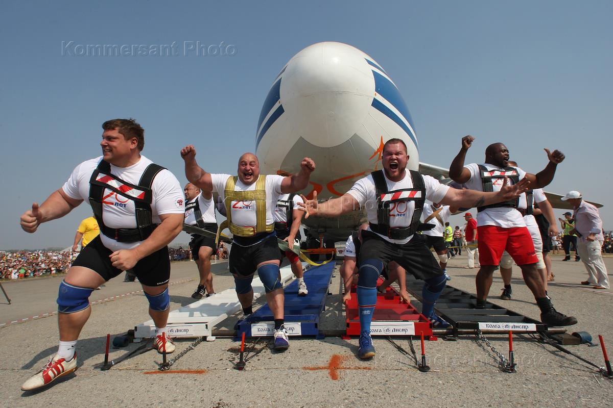 Культура Празднование Дня воздушного флота России в левобережье г. Ульяновска. Авиасалон "Ульяновск – 2010". Шоу сильнейших атлетов мира в попытке сдвинуть и переместить самый большой в мире самолет "Ан-124" "Руслан".