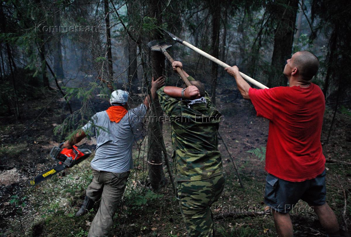 Жанровая фотография. Добровольцы во время тушения лесного пожара близ деревни Ковригино.