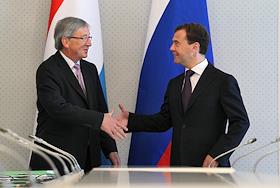 Президент России Дмитрий Медведев (слева) и премьер-министр Люксембурга Жан-Клод Юнкер (справа) во…