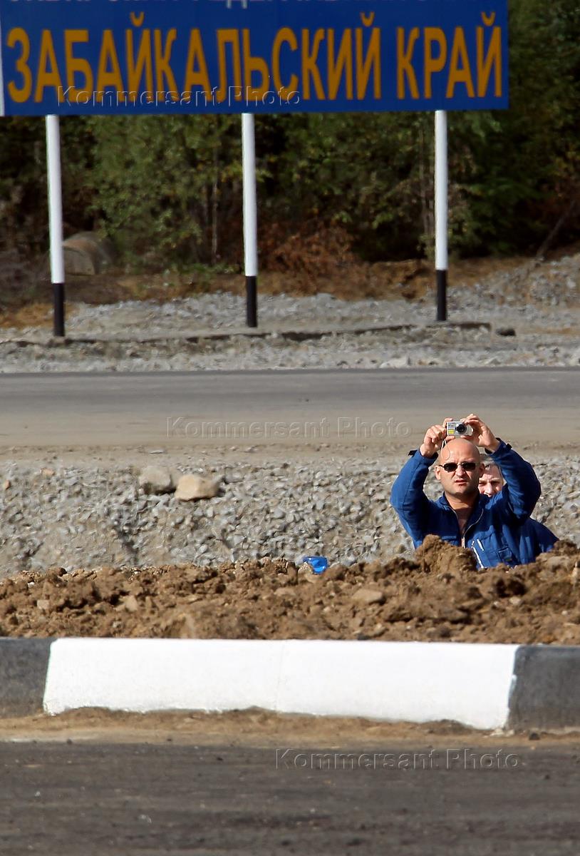 Жанровая фотография. Журналист фотографирует на обочине дороги. Плакат с надписью "Забайкальский…