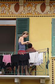 Жанровая фотография. Девушка подстригает волосы мужчине на балконе жилого дома в городе Бастия.