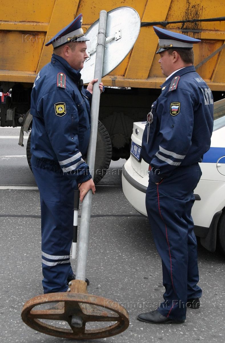 41-я Милицейская комбинированная эстафета на Садовом кольце. Сотрудник ДПС у дорожного знака…