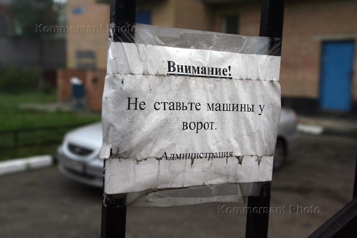 Жанровая фотография. Объявление на воротах "Внимание! Не ставьте машины у ворот. Администрация".