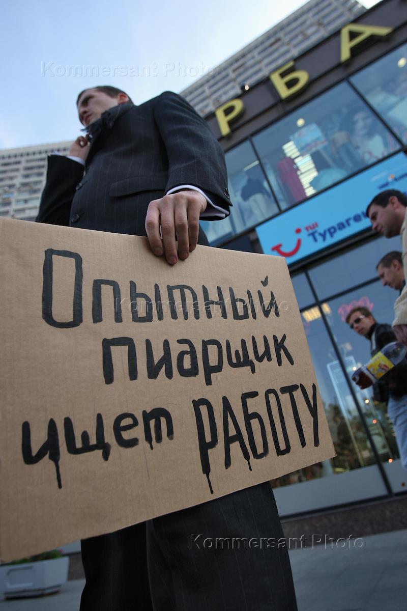 Жанровая фотография. Пиар-менеджер с табличкой о поиске работы в руках, на улицах города.